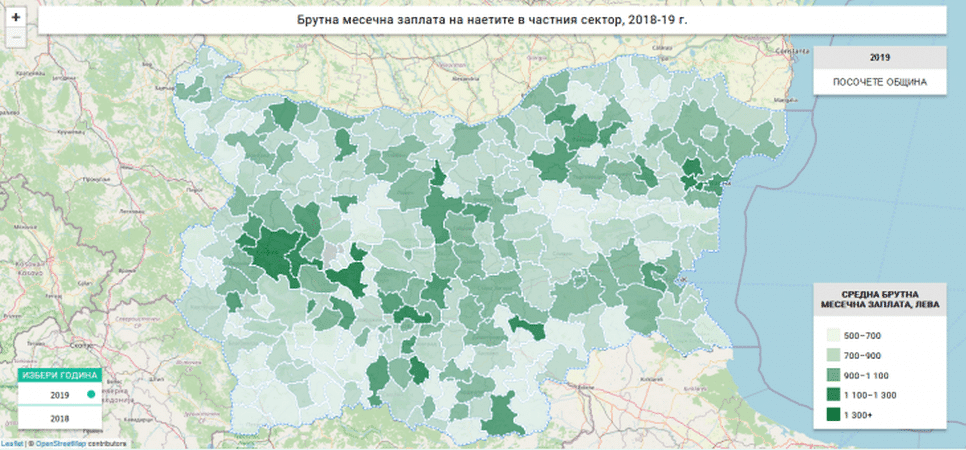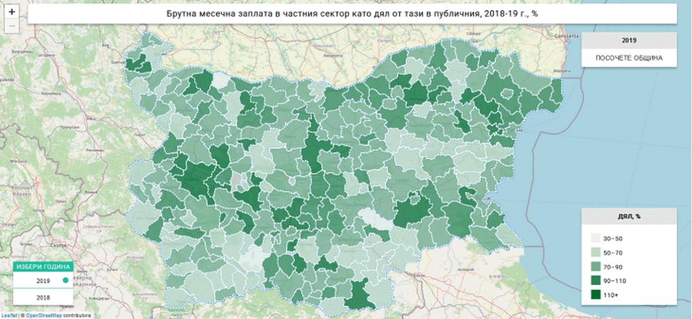 Това разпределение означава, че в повечето общини в страната средната заплата в обществения сектор изпреварва тази в частния. В 56 общини заплатата в частния сектор надвишава тази в обществения – в Средногорието и индустриалните общини около големите градове разликата е около 1.5-2 пъти в полза на частния сектор. В другите 209 общини обаче средната заплата в обществения сектор е по-висока или в два случая равна на тази в частния сектор. Разликата в някои от тях – например Козлодуй и Раднево, също може да достигне до два пъти – този път в полза на обществения сектор.