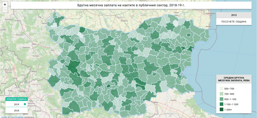 Класацията на заплатите в публичния сектор изглежда много различно. На първите три места през 2019 година са познатите Козлодуй (2 722 лв.), Раднево (2 045 лв.) и Гълъбово (1 688 лв.). След това идват големи общини – Столична (1 581 лв.), Варна (1 393 лв.) и Пловдив (1 333 лв.).