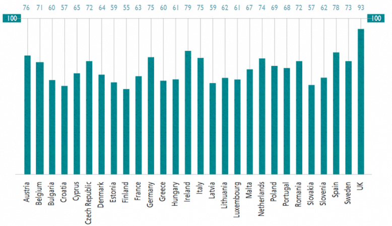 Европа отговаря за около една трета от световните застрахователни премии. Достъпът до развити застрахователни продукти позволяват на домакинствата и бизнесът да измерват, управляват и покриват рискове. За 2020 най-либерализирани са пазарите на Франция и Обединеното кралство (и двете 100), Австрия (99), Германия (92), и България и Кипър с 84. Най-зле представилите се държави са Дания (39), Финландия (49) и Чехия (51).