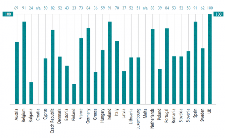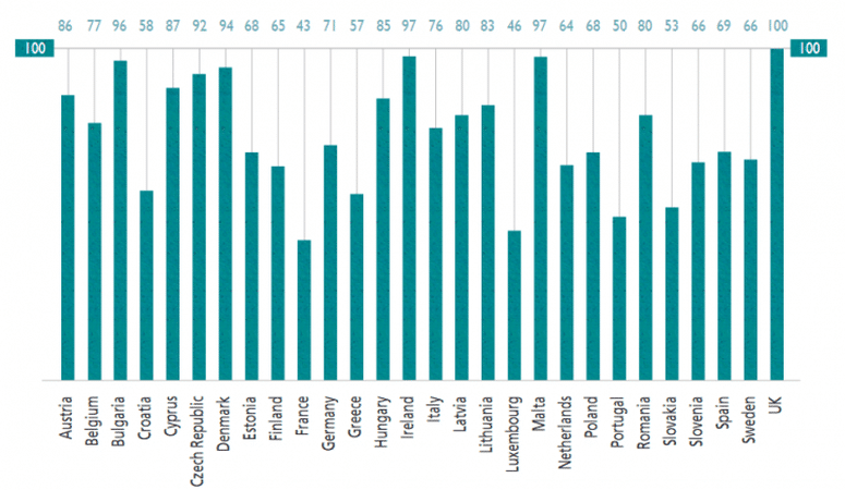 През 2019 година, най-либерализираната държава на пазара на труда е Обединеното кралство (100), благодарение на гъвкавото си трудово законодателство. Плътно я следват Ирландия и Малта (и двете с 97), докато България е трета с 96. По-гъвкави закони в сферата предполагат по-бързо възстановяване, и по-ефикасно разпределение на производствените фактори.