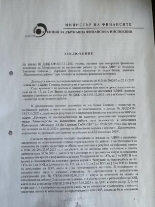 На 24 април Софийска градска прокуратура /СГП/ предяви постановление за привличане в качеството на обвиняем на бивш служебен министър на вътрешните работи за безстопанственост в размер на 1 482 218 лева. Досъдебното производство е образувано на 16.01.2024 г.