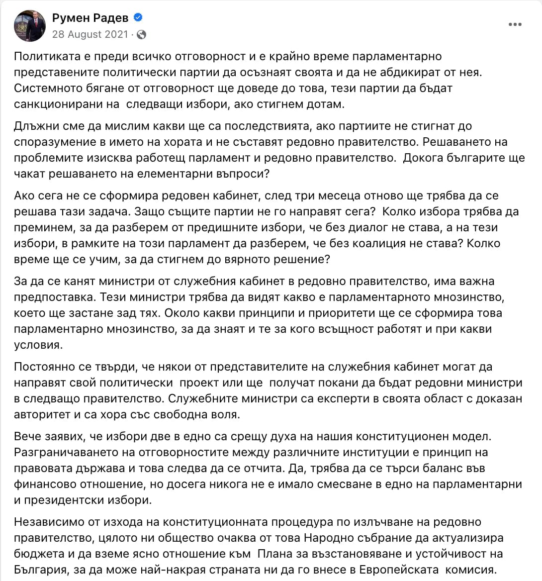 На 28 август 2021 година президентът Румен Радев е апелирал за диалог между партиите, обвинявайки ги, че нямат волята да направят коалиция помежду си и да сформират редовен кабинет.