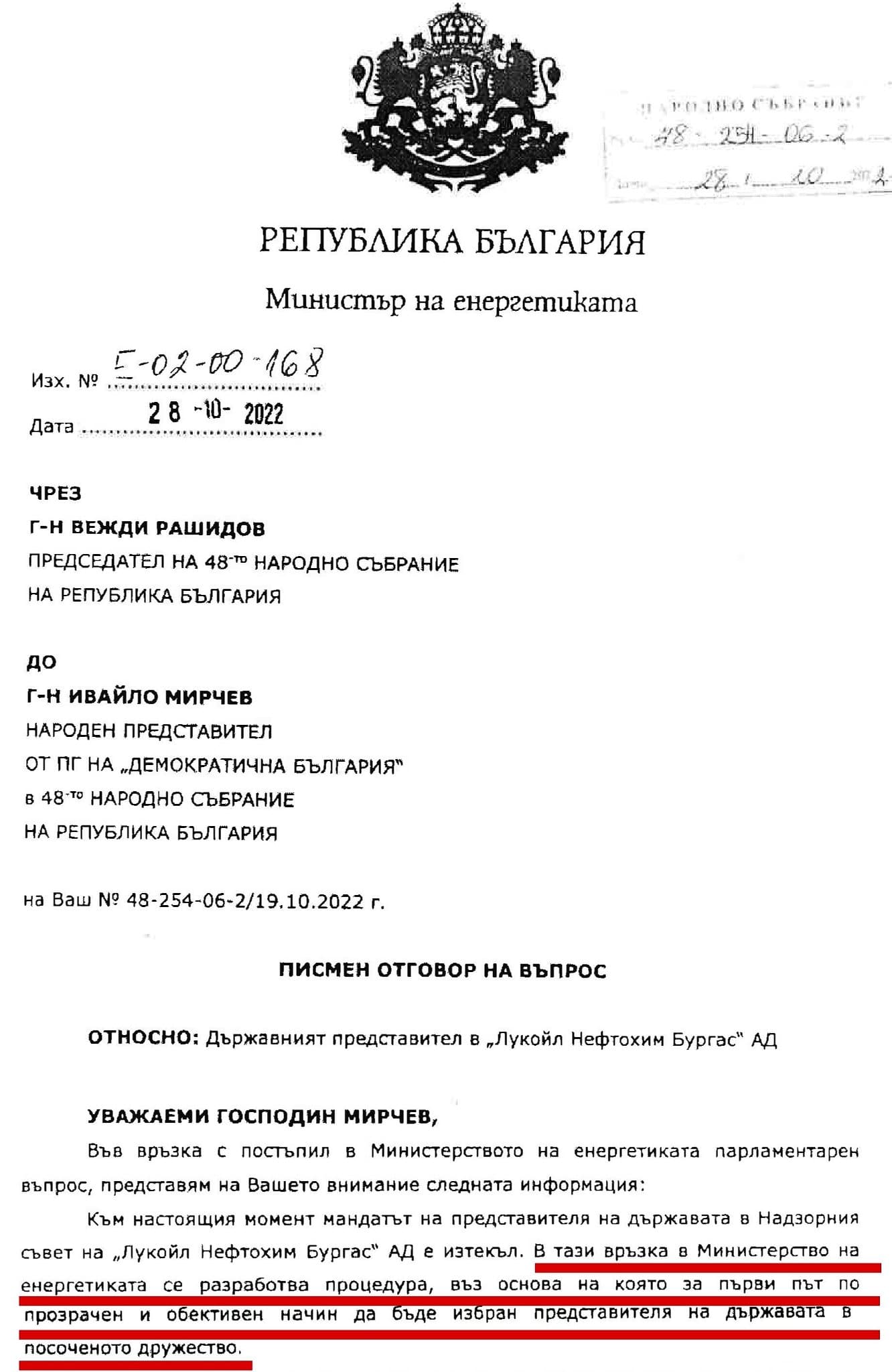 Именно заради това депутатът е отправил парламентарен въпрос към министъра на енергетиката за смяната на Красимир Първанов като представител на България в „Лукойл“. Мирчев е получил отговор, в който се посочва, че подобна смяна се подготвя и ще бъде обявен конкурс.