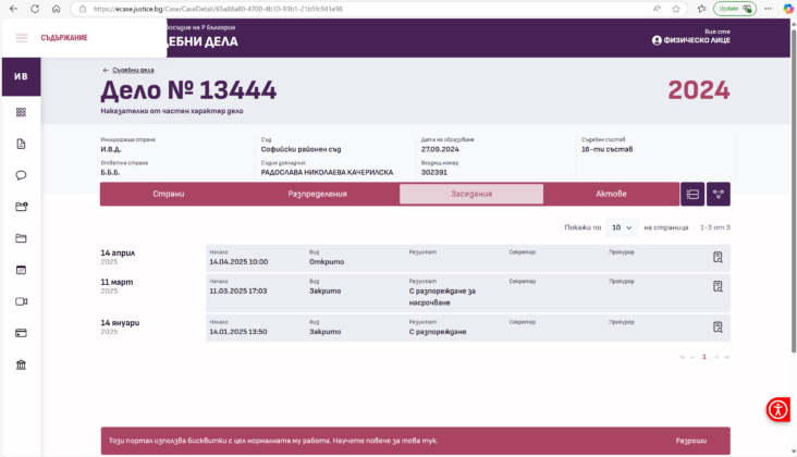 Пояснявам: Наказателно дело 13444/2024 година, в Наказателно Отделение на Софийски Районен Съд, 16 състав, бул. „Ген. М.Д.Скобелв” № 23, 10:00 на 14.04.2025.
