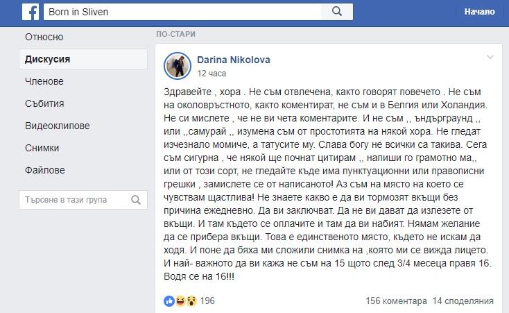 Публикация от нейния профил, разпространен във „Фейсбук“ групата „Born in Sliven“ хвърли нова светлина по случая. Много от приятелите й я съветват да се завърне в семейството си, други й пожелават успех по пътя, който е поела. Ето какво гласи постът дословно, без редакторска намеса: