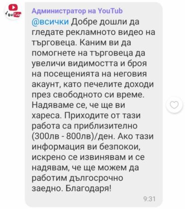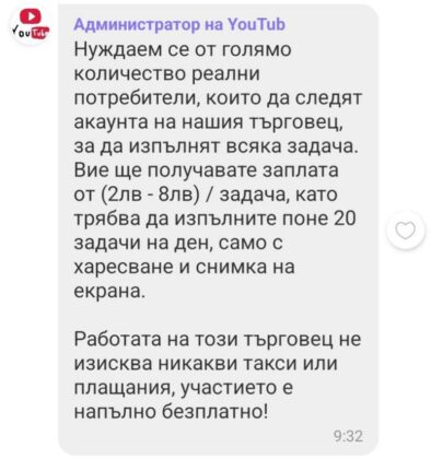 Нова вълна от онлайн измами се разпространява чрез приложението Viber. Потребители съобщават, че са добавени в групи с подвеждащи имена като „YouTube онлайн работа“, където им се предлага възможност за доход между 300 и 800 лв. на ден само чрез харесвания и абонаменти в YouTube. На пръв поглед „работата“ не изисква плащане, но след първите задачи потребителите биват приканени да се свържат лично с организаторите и постепенно започват да инвестират собствени средства, уж за да преминат на по-високи нива с по-големи печалби.