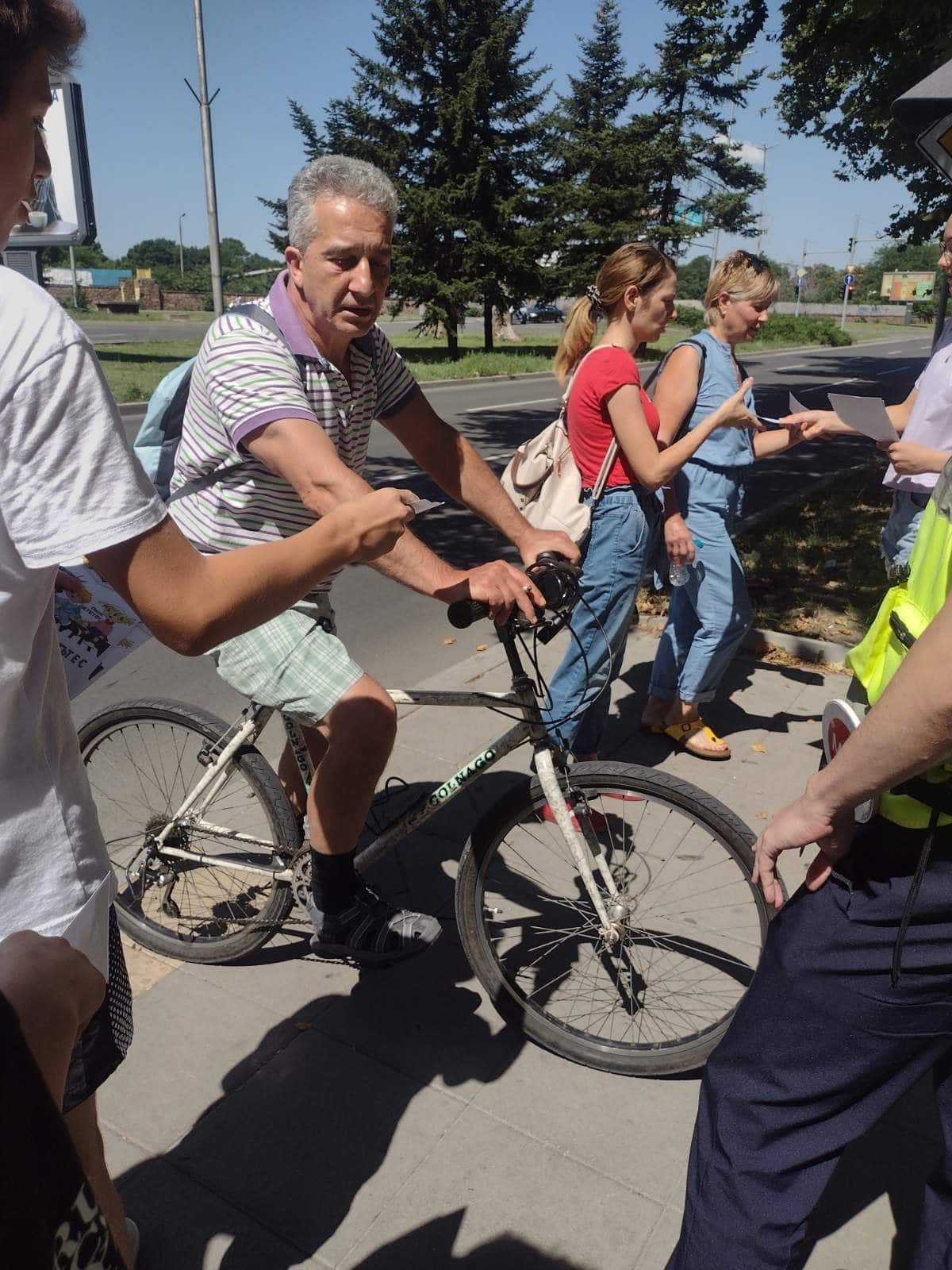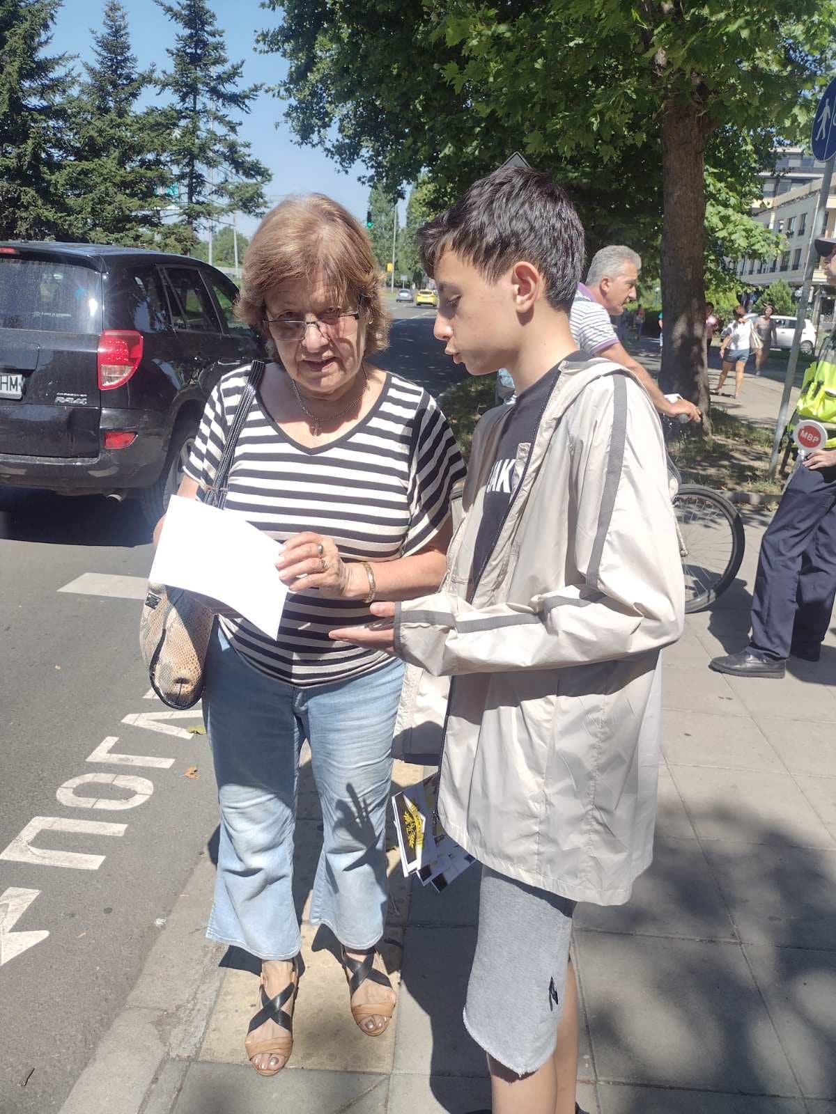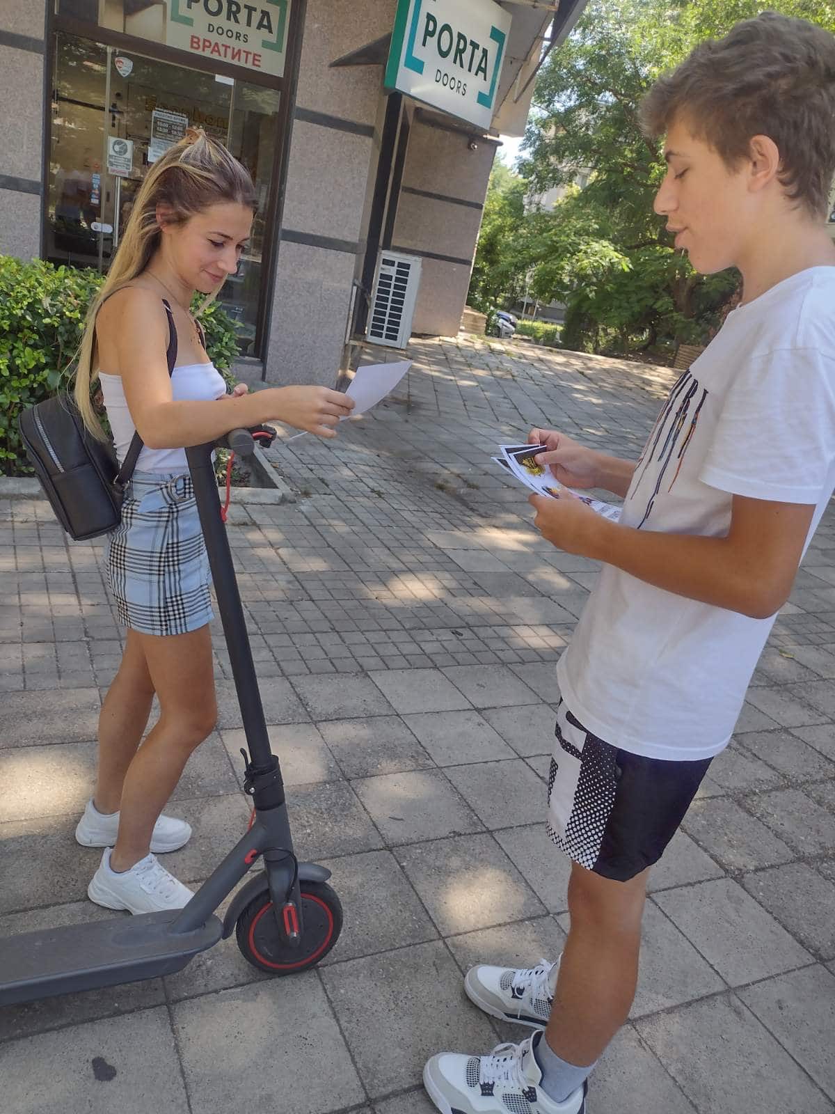 Със съдействието на служители от Пето Районно управление подрастващите активно разясниха целите на кампанията, в която включиха най-честите участници в пътния трафик – пешеходци, автомобилисти, колоездачи и водачи на електрически тротинетки.