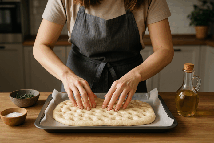 Оформяне и подготовка за печене: Загрейте фурната на 200°C. Постелете тава с хартия за печене и изсипете тестото директно в нея. С пръсти го разпределете равномерно, като оформите типичната фокача форма с малки вдлъбнатини по повърхността.