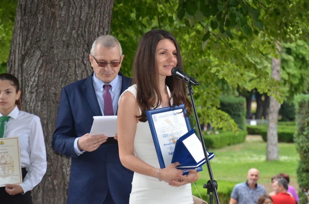 Председателят на Общинския съвет Генади Велков връчи три специални награди. С почетна грамота и плакет за изключителен принос в развитието на средното образование и високи постижения на ученици в областта на математиката бе удостоен Тома Георгиев, старши учител по математика в ППМГ „Екзарх Антим I“, като от негово име наградата прие директорът на училището Румяна Петрова. С грамота за проспериращ млад учител бе отличена Кристина Ванчева, учител по икономически дисциплини в Средно училище „Петко Рачов Славейков“. Грамота получи и Мария Колева, ресурсен учител в Регионален център за подкрепа на процеса на приобщаващото образование за работа с деца със специални образователни потребности.