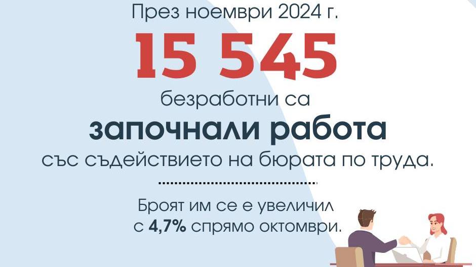 Общо 15 545 безработни са започнали работа в България през ноември, отбелязвайки ръст от 4.7% /или 693 души/ спрямо предходния месец. 320 души от групите на търсещите работа заети, учащи и пенсионери също са намерили реализация с подкрепата на трудовите посредници.