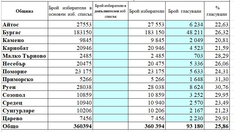 Според процентите – най-активни са гласоподавателите в Приморско, където 1648 души са стигнали до урните, а най-нисък интерес към вота има в Камено – 2049 души са гласували. В областния град правото си на глас са упражнили 48211 души.