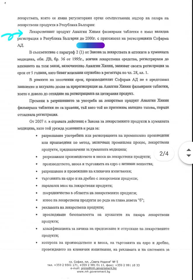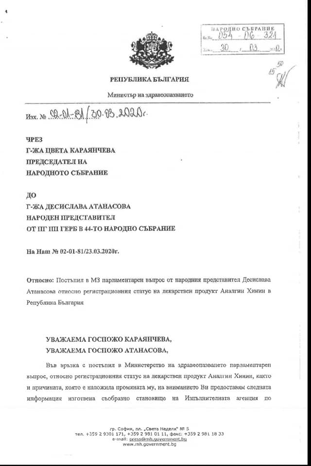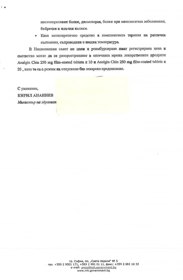 Депутатът е получила отговор от Ананиев, който публикува в профила си в социалната мрежа Facebook. В него се посочва, че Аналгин-Хининът е имал валидна регистрация в България до 2000 година. Причината е, че с приета промяна в Закона за лекарствата и аптеките в хуманната медицина от 1995 година, всички лекарствени средства, регистрирани до влизането на нормативния документ в сила, включитено и Аналгин-Хининът, запазват своята регистрация за срок от 5 години.