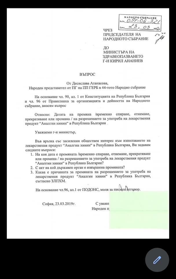 Поради това тя е отправила официален въпрос в качеството си на народен представител до министъра на здравеопазването Кирил Ананиев. В него Атанасова пита кога е отнето разрешението за употреба на медикамента в България, както и с акт на кой държавен орган е извършена промяна. Освен това Атанасова е отправила въпрос каква е причината за промяната на разрешението за употреба на лекарството.
