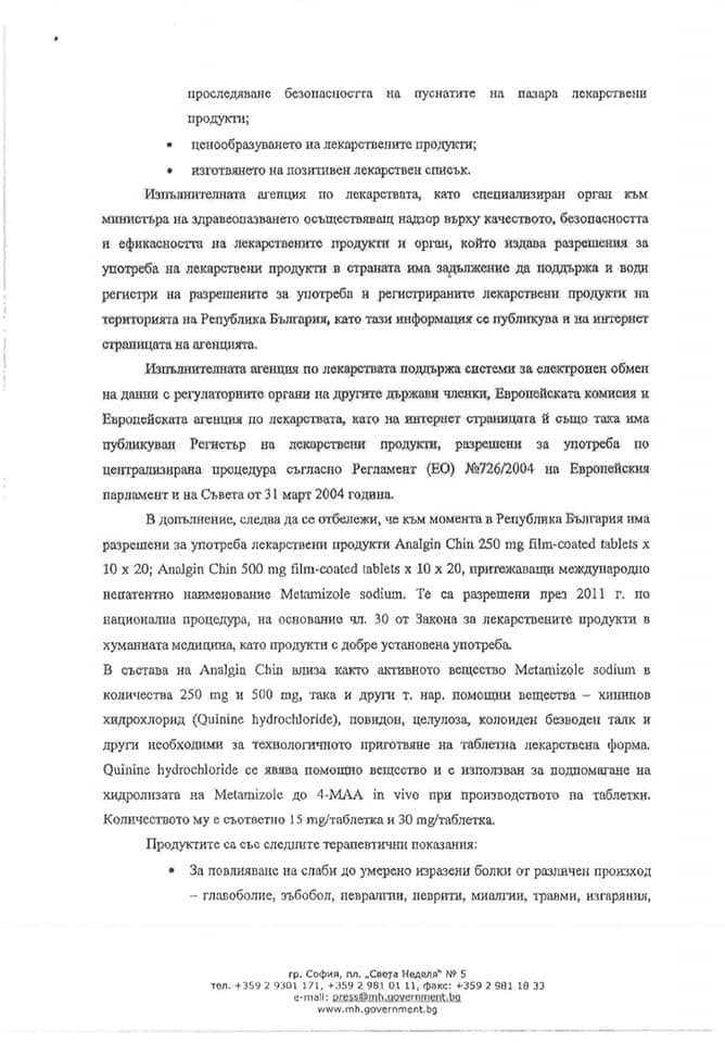 Освен това от Министерството на здравеопазването посочват, че в момента у нас има разрешени за употреба лекарствените продукти Analgin Chin 250 mg и Analgin Chin 500 mg. Те притежават международното наименование Metamizole sodium. Разрешени са през 2011 година по национална процедура.