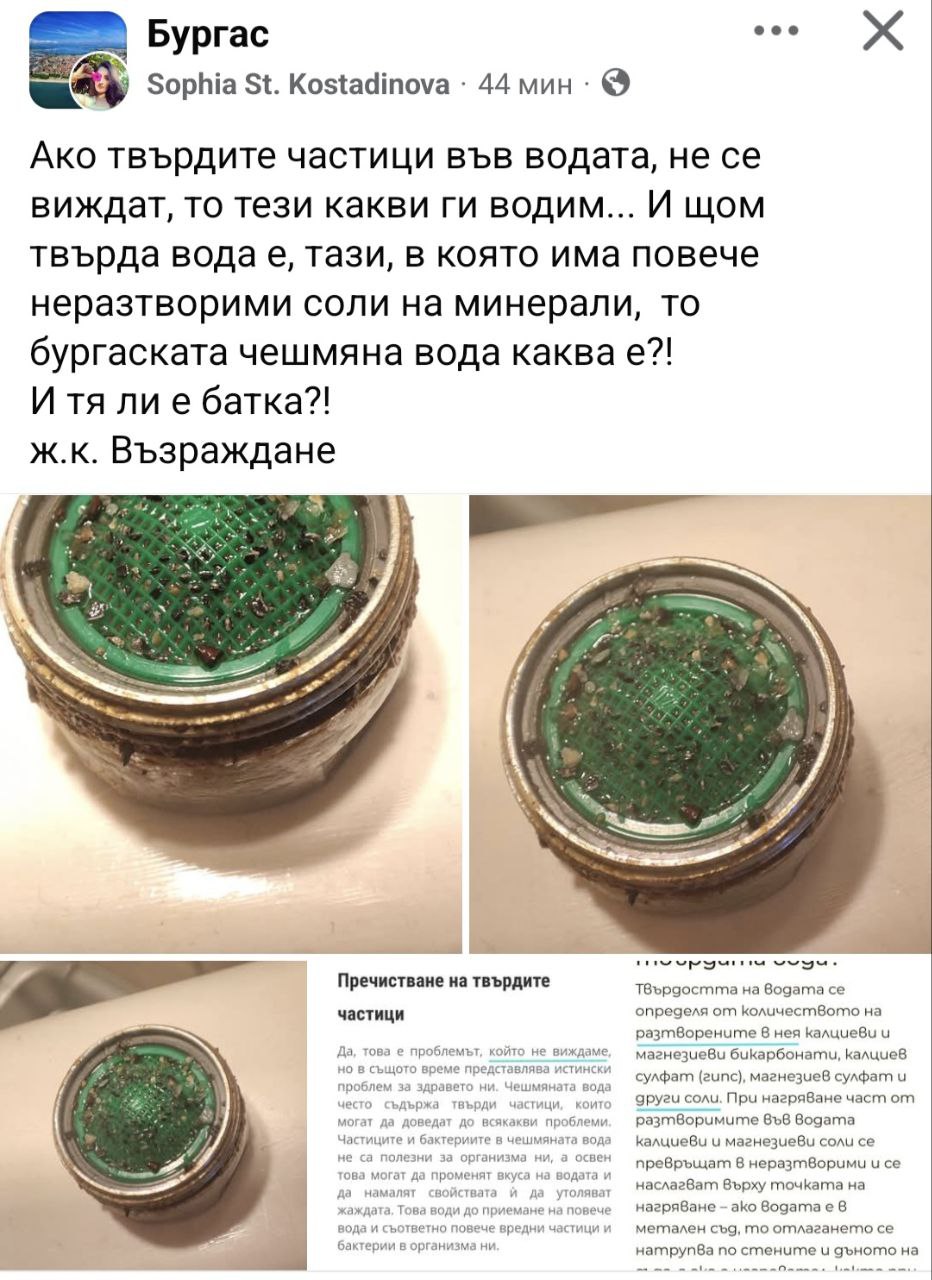 „Ако твърдите частици във водата, не се виждат, то тези какви ги водим… И щом твърда вода е, тази, в която има повече неразтворими соли на минерали, то бургаската чешмяна вода каква е?!“