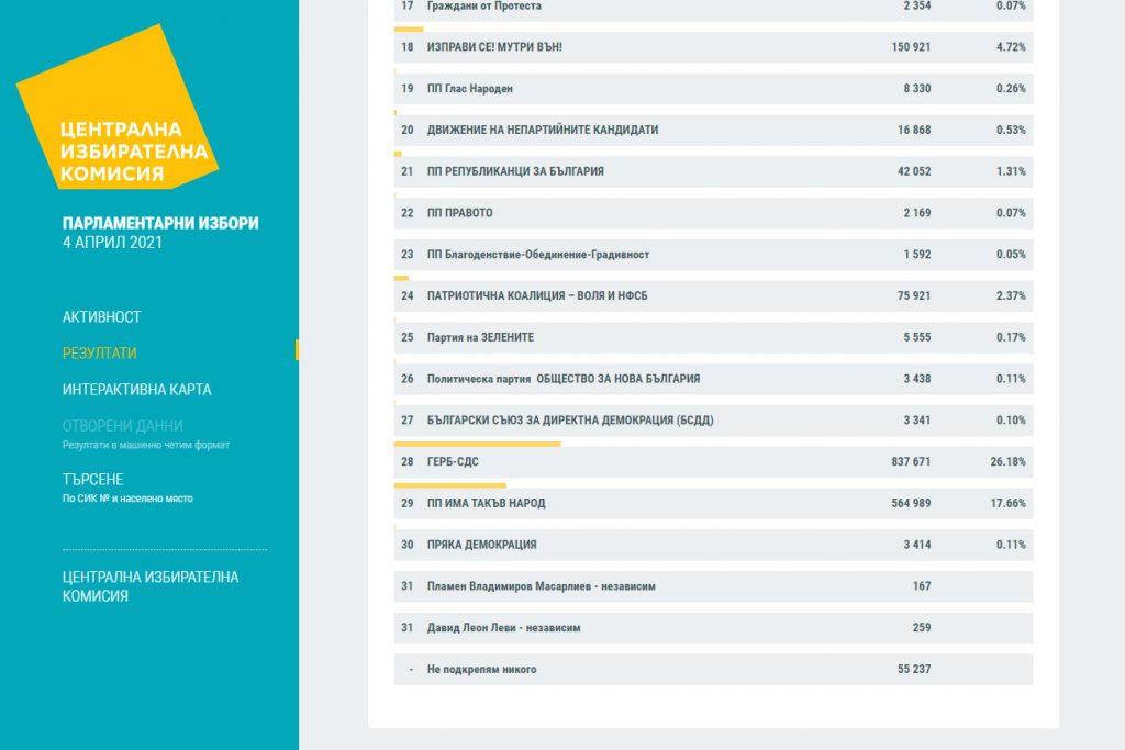На първо място са ГЕРБ-СДС с 26,18%. За тях са гласували 837 671 души. На втората позиция се нарежда „Има такъв народ“ със 17,66 на сто. За тях бюлетина са пуснали в урните 564 989 избиратели. Както Искра.бг вече ви съобщи формацията на Слави Трифонов е първа в чужбина.