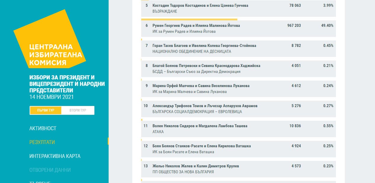 От Централната избирателна комисия обявиха междинни резултати от изборите 2 в 1 при над 75% обработени протоколи. Румен Радев категорично печели първия тур на вота за държавен глава, а „Продължаваме промяната“ запазва своята преднина пред вторите ГЕРБ-СДС.