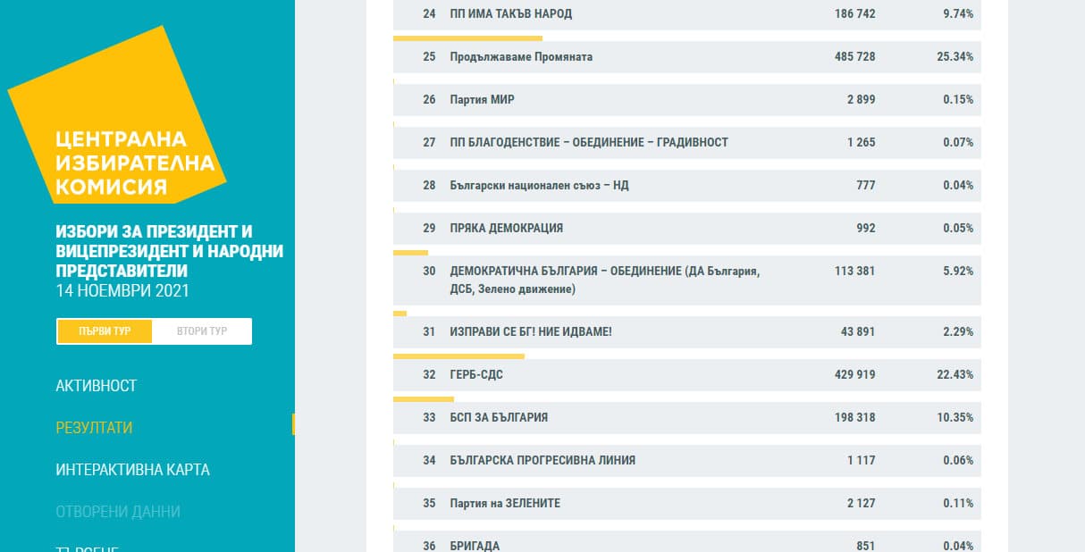 Резултати от парламентарните избори. Снимка: Скрийншот от ЦИК