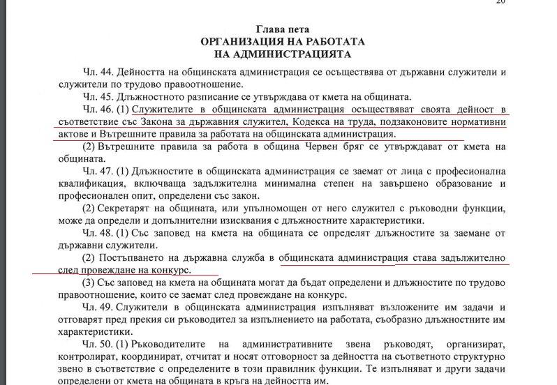 Въпросната декларация показва още, че Джабилова е назначена като държавен служител в Община Червен бряг.  Според глава 5 от Устройствения правилник на Община Червен бряг чл. 46 (1) Служителите в общинската администрация осъществяват своята дейност в съответствие със Закона за държавния служител (ЗДЛ), Кодекса на труда, подзнаковите нормативни актове и Вътрешните правила за работа на общинските администрации.