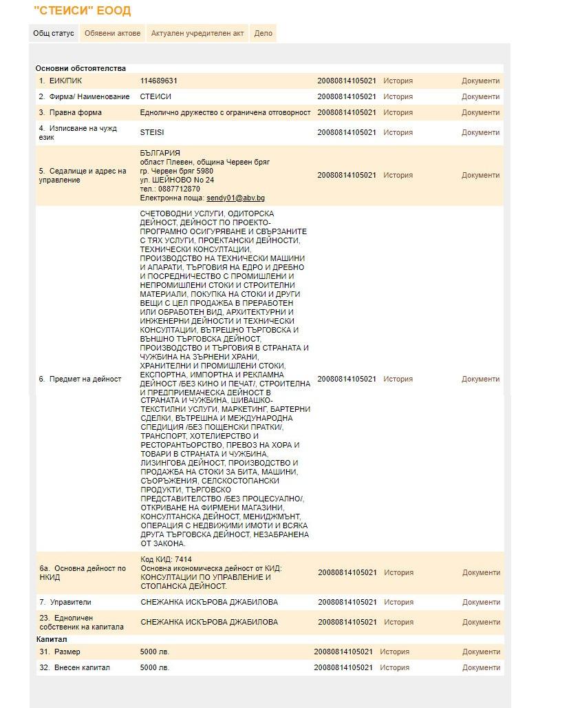 Справка в Търговския регистър обаче показва, че Снежанка Искърова Джабилова е едноличен собственик и управител във фирма „СТЕИСИ“ ЕООД. Същата е учредено на 15 януари 2008 г., а дейността й според Търговския регистър към момента не е прекратена. Седалището на „СТЕИСИ“ ЕООД е в град Червен бряг, улица „Шейново“ No 24