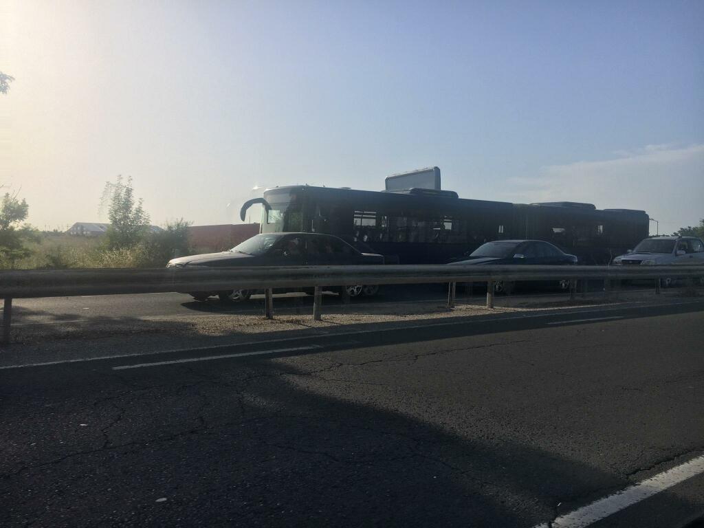 Близо 2-километрова колона от автомобили се е образувала на главния път от Слънчев бряг в посока Бургас. Струпването на превозни средства започва още в района на разклона за град Каблешково и продължава до колелото за кръгово движение при Бургаски гробищен парк.