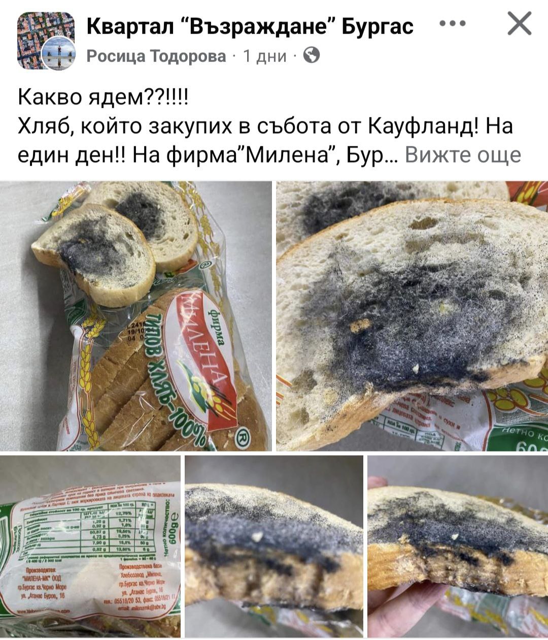 Жена от Бургас сподели в социалните мрежи за мухлясал хляб, закупен от известна хранителна верига. Тя публикува снимки и написа под поста си: