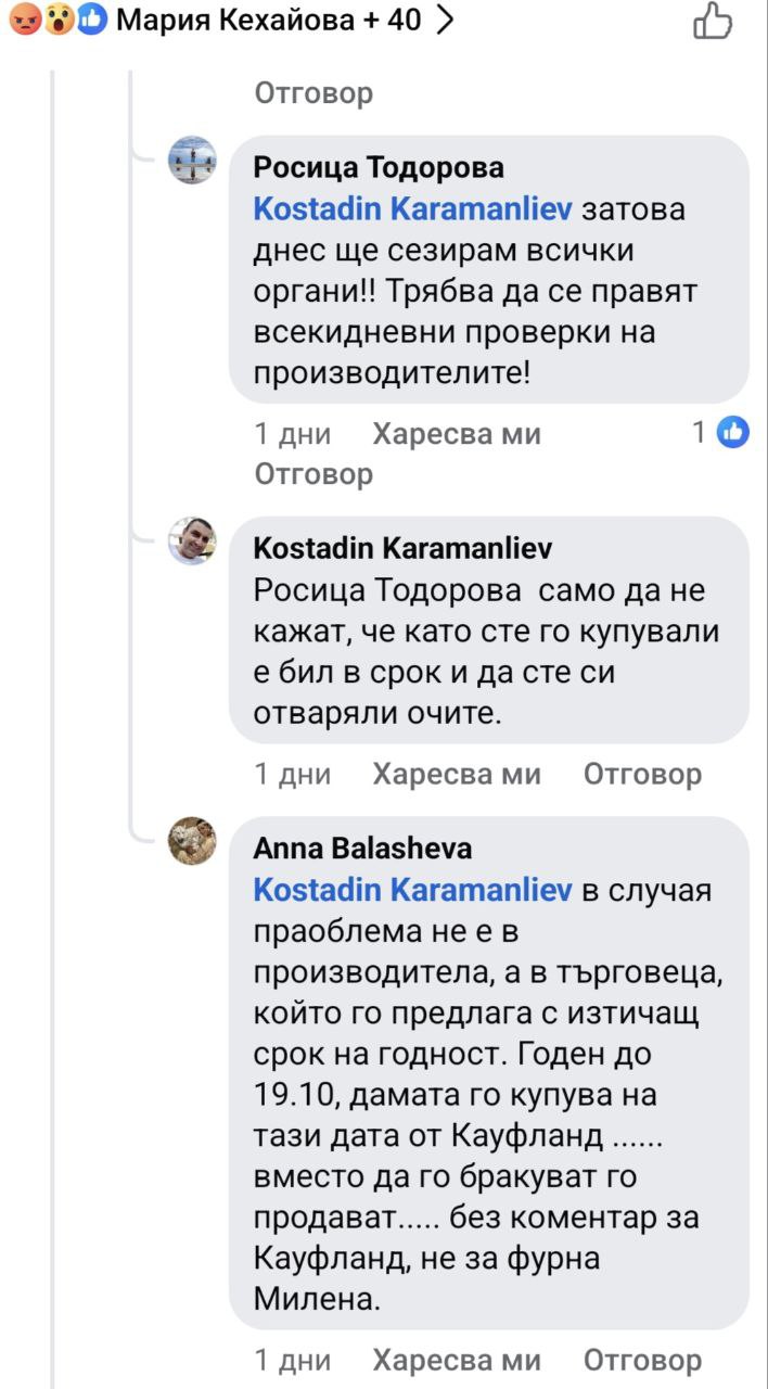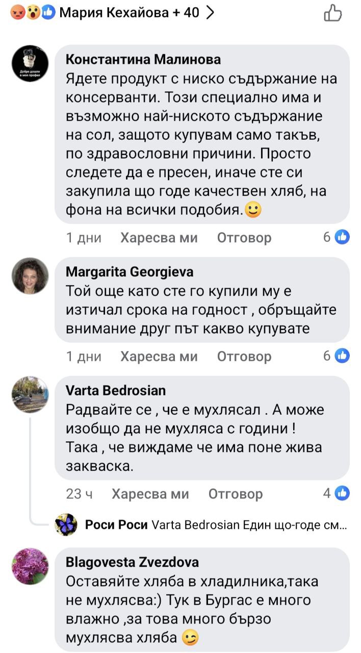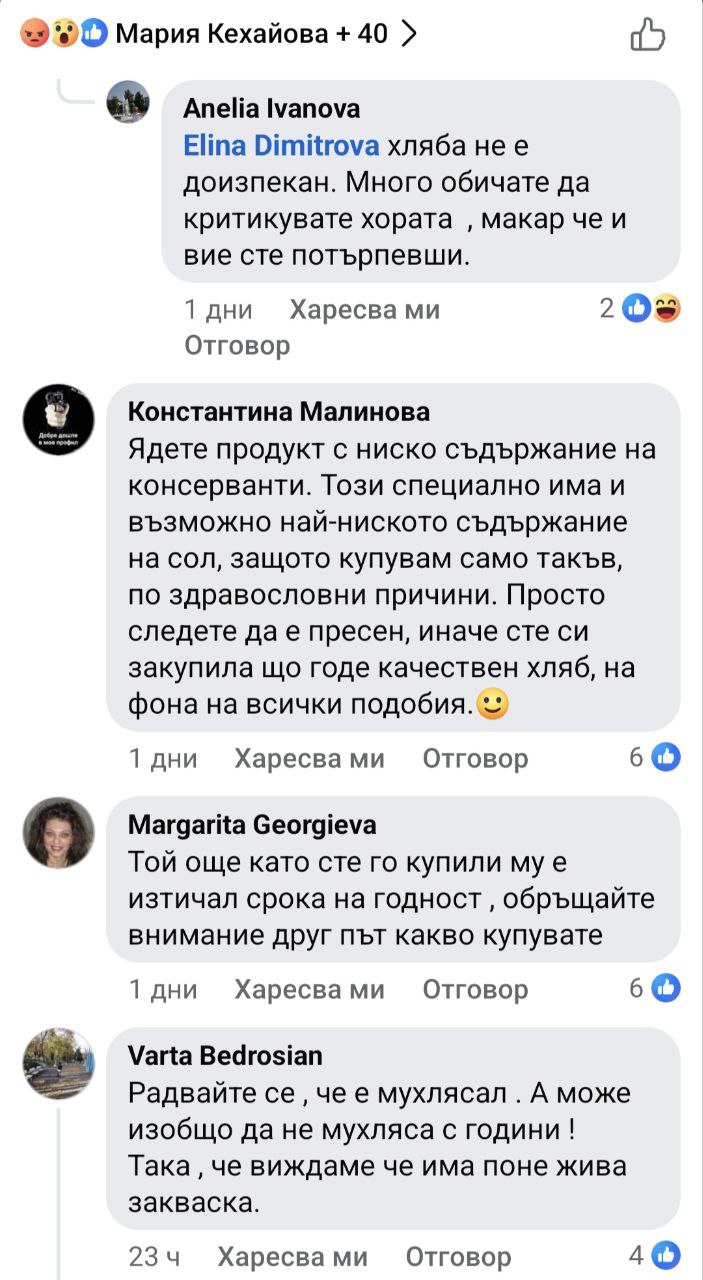 „Обръщайте внимание друг път какво купувате“, предупреди един от коментаторите, който посочва, че хлябът е бил със срок на годност до събота. В същото време някои коментари насочиха вниманието към нуждата от по-чести проверки на производителите и търговците.