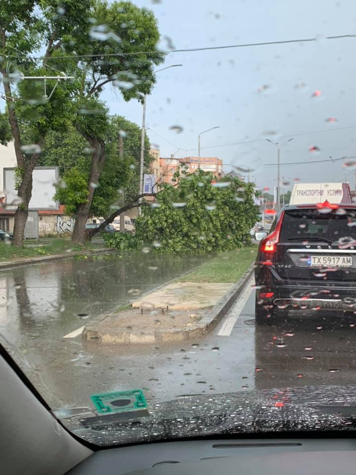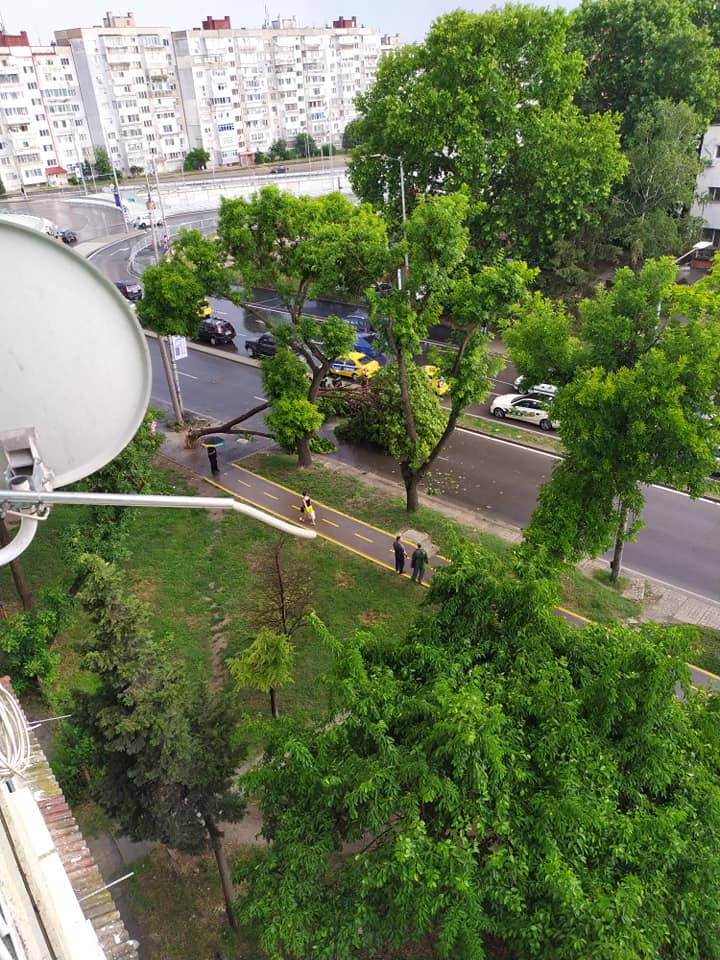 Инцидентът е станал малко след 16:00 часа днес в платното в посока кварталите, много близо до Пожарната. Най-вероятната причина за злополуката са силният вятър и проливният дъжд.