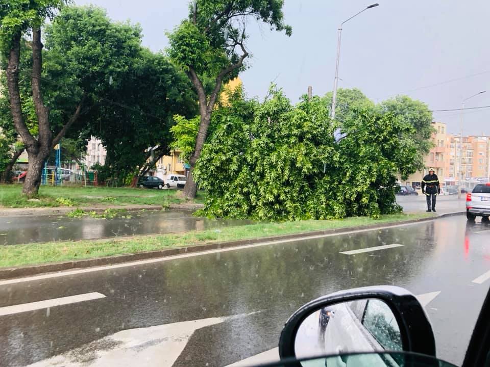 Екипи на Пожарна безопасност и защита на населението са реагирали своевременно и работят по отстраняване на падналия клон.