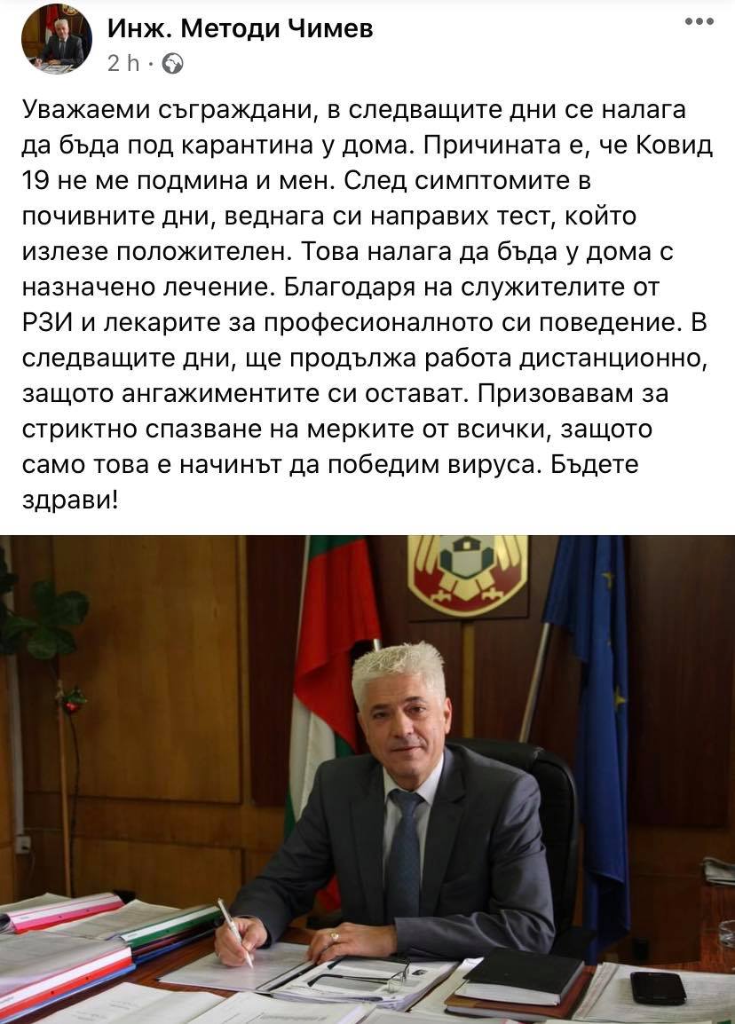 Кметът на Дупница инж. Методи Чимев е с положителен резултат от тест за COVID-19, съобщиха от Общината. През следващите дни той ще бъде под карантина в дома си. Чимев коментира:
