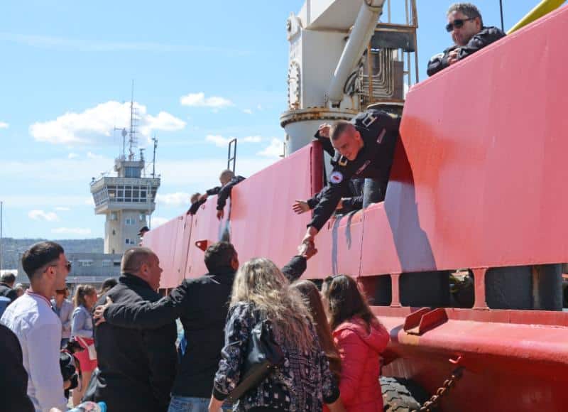 На българска земя екипажът бе посрещнат под съпровода на гайди и огромен обществен и граждански интерес. На официалната церемония присъстваха проф. д-р Андрияна Андреева – областен управител на Варна, флотилен адмирал Боян Медникаров – началник на Военноморско училище „Н.Й. Вапцаров“, проф. д-р Христо Пампирев – председател и учредител на Българския антарктически институт, кап. I-ви ранг Ваньо Мусински – началник на Щаба на ВМС, д-р Илин Димитров – секретар по туризъм, култура и образование на президента на Република България, Даниел Христов – дирекция „Консулски отношения“ към Министерството на външните работи на Република България, близки, деца и учители от училище „Св. Св. Кирил и Методий“.