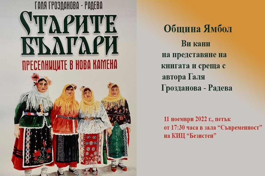 Книгата „Старите българи: преселнците в Нова Камена“ ще бъде представена в Ямбол на 11 ноември от 17:30 часа. Събитието ще се проведе в зала „Съвременност“ на Културно-информационния център „Безистен“. Книгата е на д-р Галя Грозданова-Радева, съобщиха от Общината.