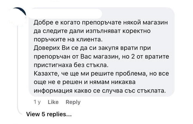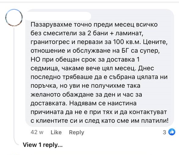 Неспазен е бил и срок за доставка на смесители за бани, ламинат и гранитогрес, алармира друг купувач, останал излъган от препоръките и рекламните клипчета.