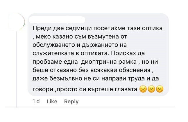 Жена е възмутена от обслужване и държание на служители на оптика, която е била посочвана като надеждна – „беше отказано, без всякакви обяснения“.