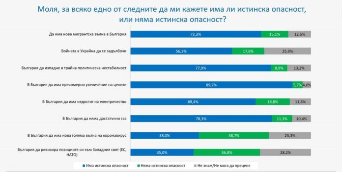 Близо 90% намират за реална опасността увеличението на цените у нас да стане прекомерно. Тук обществото е на практика единодушно. Опасности като потенциален недостиг на газ, респ. отопление се намират за реални от близо 80% от българите.