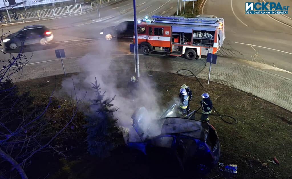 Автомобилът най-вероятно се е запалил в движение поради техническа неизправност, а шофьорът е успял да се добере до градинката в средата на кръговото кръстовище, след което е напуснал автомобила.. От кадрите се вижда, че той е почти напълно унищожен от огъня.