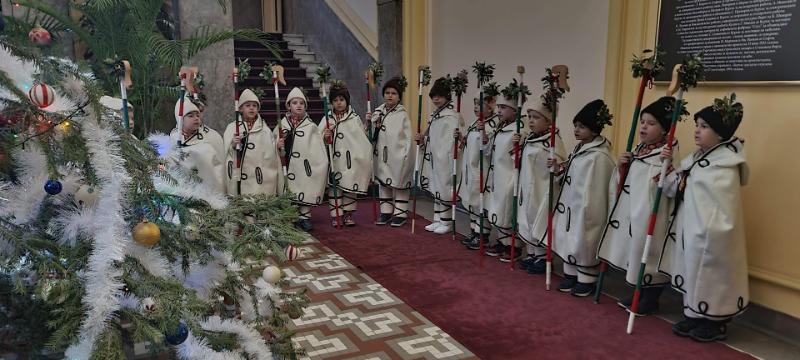 Проф. Нейкова лично посрещна скъпите гости. С дебели ямурлуци, с ритуални геги с краваи и китка за здраве, богато украсени калпаци и с греещи от усмивки лица, малчуганите представиха богат репертоар от коледарски песни и наричания и зарадваха служителите на администрацията със знанията си за традициите.
