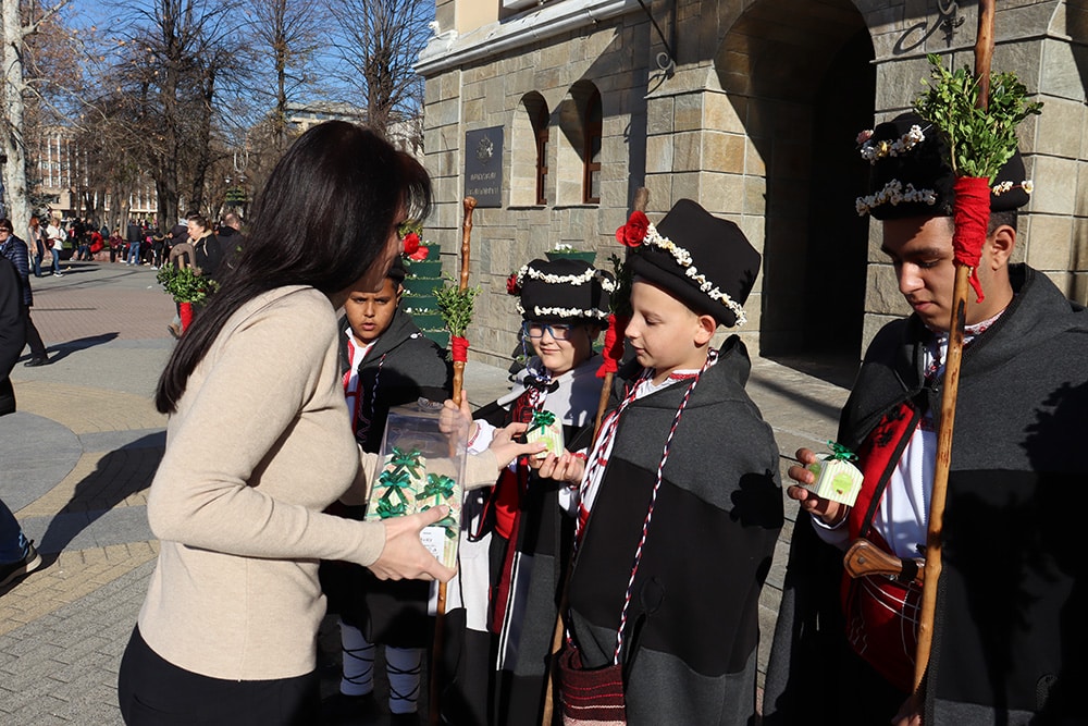 Малките пазители на българските традиции изпълниха традиционни народни песни, наричания и танци в централна градска част. И както повелява традиция, бяха изпратени с подаръци и пожелания за здраве и благодат.