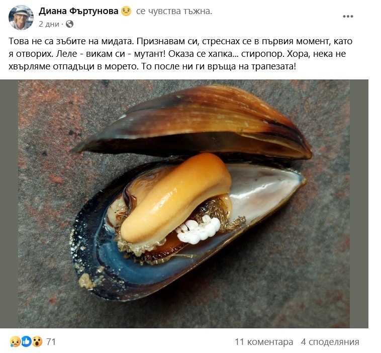 Журналистът Диана Фъртунова сподели в социалните мрежи своята необичайна находка в закупени от нея миди. В една от тях открила стиропор. Тя пише: