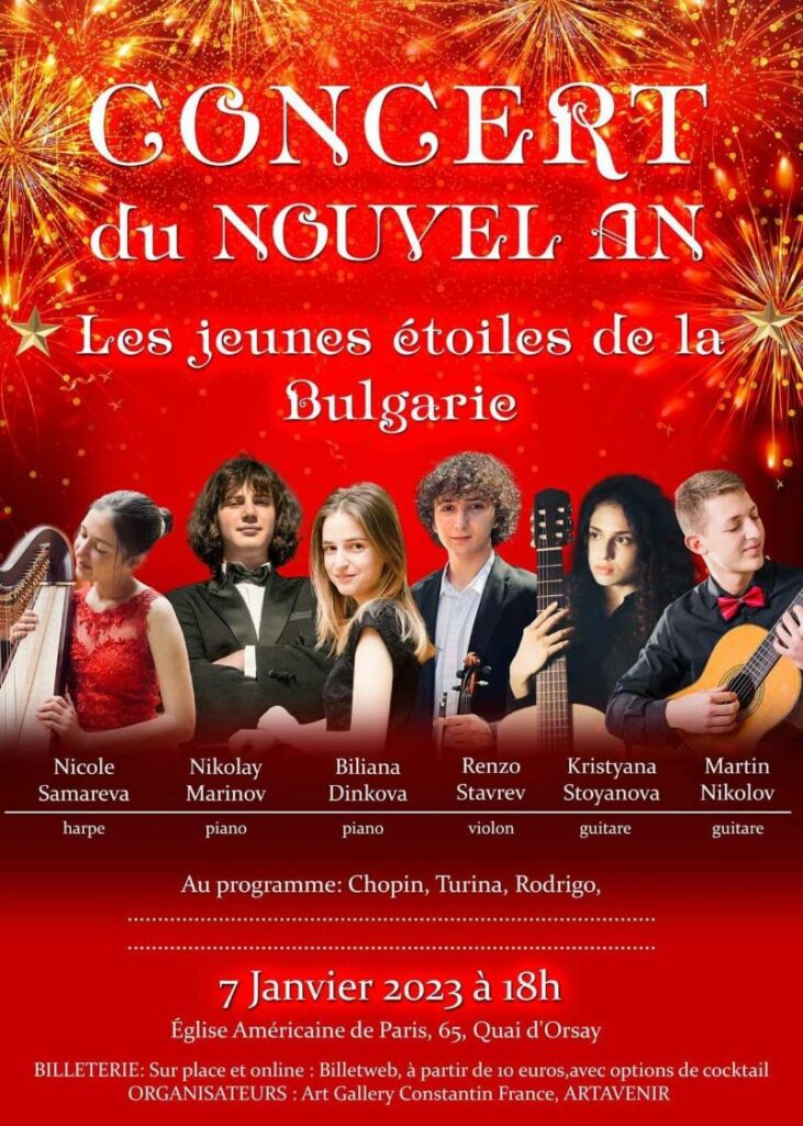 Събитието ще се състои на 7 януари от 18:00 часа в сърцето на Париж – Église américaine de Paris, Quai d’Orsay, Paris, France /Американската църква в Париж/ и е посветено на светлите Новогодишни празници, предстоящите Йорданов, Ивановден, както и на френския Epiphanie.