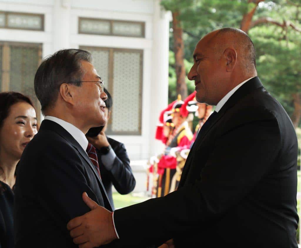 Българският министър-председател се срещна с държавния глава на Южна Корея Мун Дже-ин в Президентския дворец. Двамата лидери изтъкнаха, че са изключително доволни от разговорите между тях. Борисов коментира още, че за България е приоритетно да се привлекат корейски инвестиции и да се разшири българският износ за Република Корея. И добави: