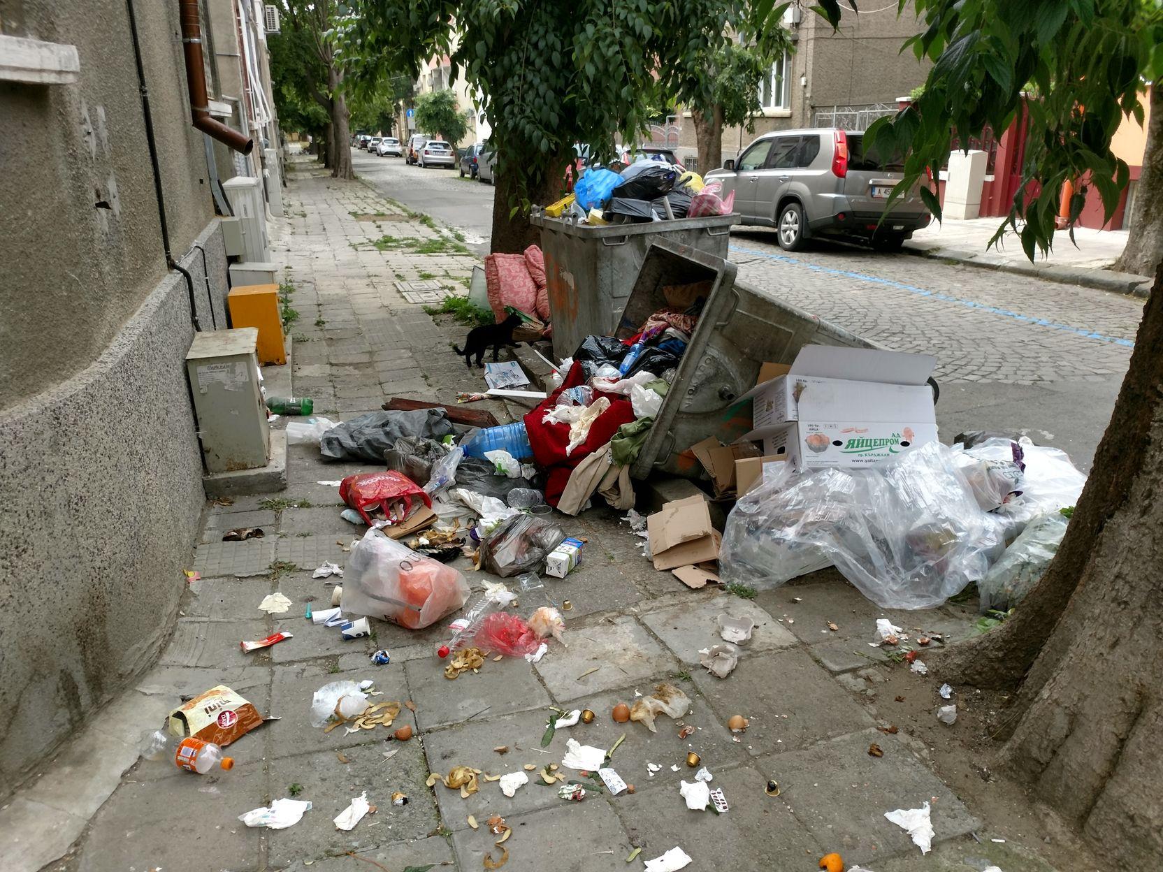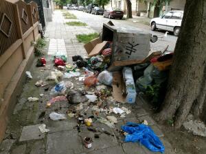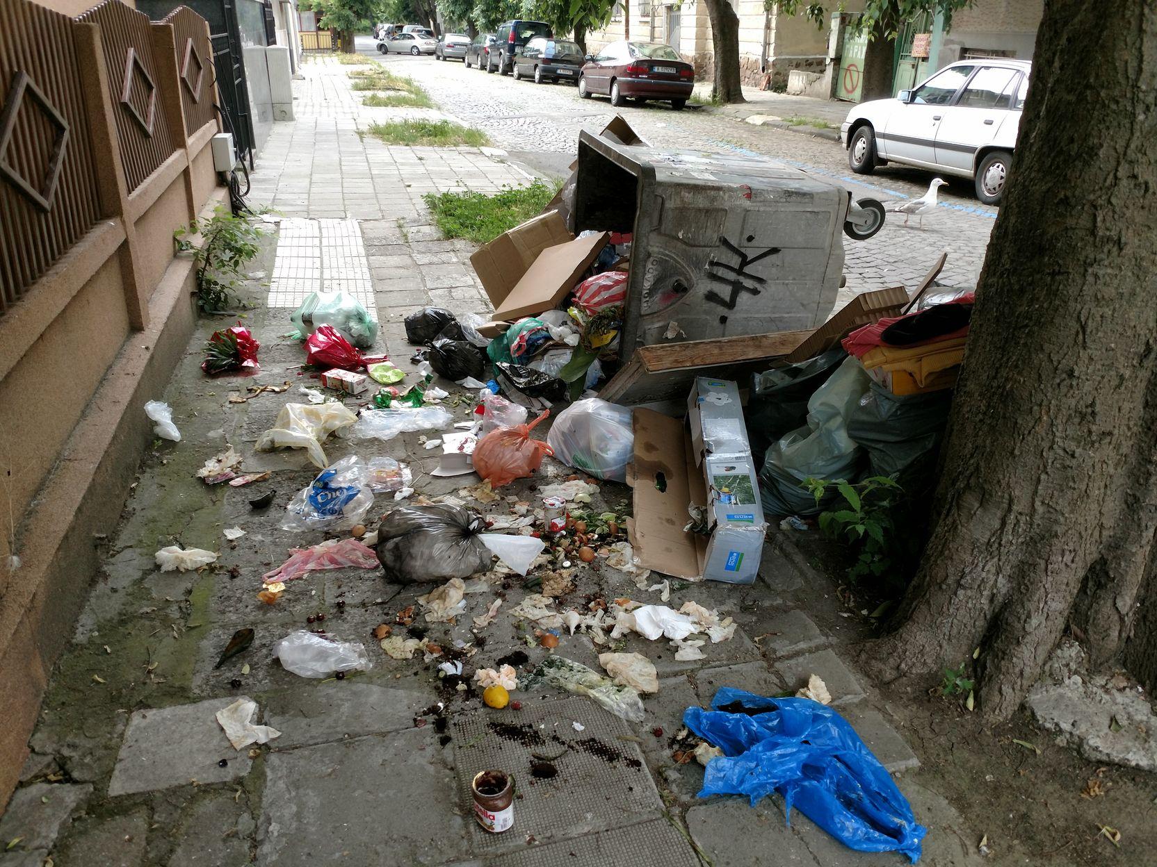 Разхождах кучето в квартала и се натъкнах на грозна гледка. Мястото е в центъра на града и е на метри от Морската градина. Левият контейнер е на ъгъла на две улици, по едната от които ежедневно преминават стотици души.