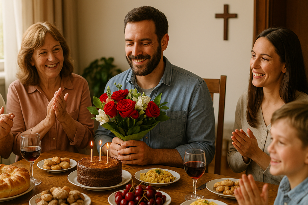 - Трапеза и подаръци – На масата обикновено има домашни ястия, сладкиши, торта, напитки. В офиса или в училище именникът често носи бонбони или курабийки за колегите и съучениците. Пожеланията: „Да ти е живо и здраво името“, „Да го чуваш само за добро“ звучат официално и искрено.