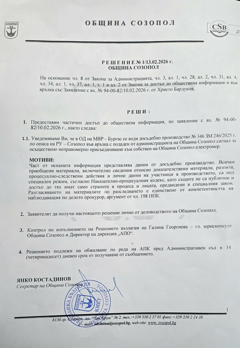 Община Созопол е отговорила на Христо Бардуков в законоустановения срок, като му е предоставила частичен достъп до поисканата от него информация. От местната управа са отговорили, че наистина е констатирана кражба на ток, за което е подаден сигнал в ОДМВР-Бургас и там е образувано досъдебно производство по случая.