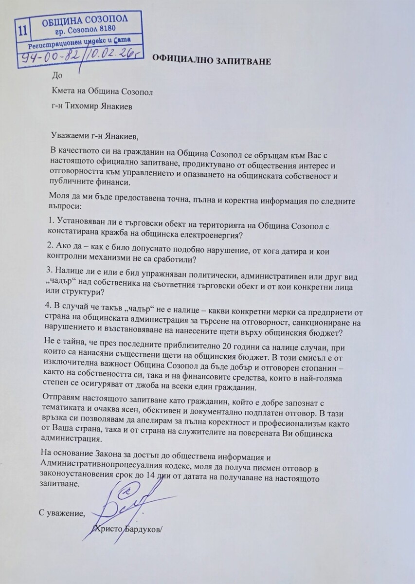 Христо Бардуков е подал заявление по Закона за достъп до обществена информация /ЗДОИ/ за евентуална кражба на общински ток в Община Созопол, с което Искра.бг разполага. В него той е поискал да разбере дали наистина има осъществено подобно престъпление и какви действия е предприела Община Созопол, ако е констатирана кражба на електроенергия.