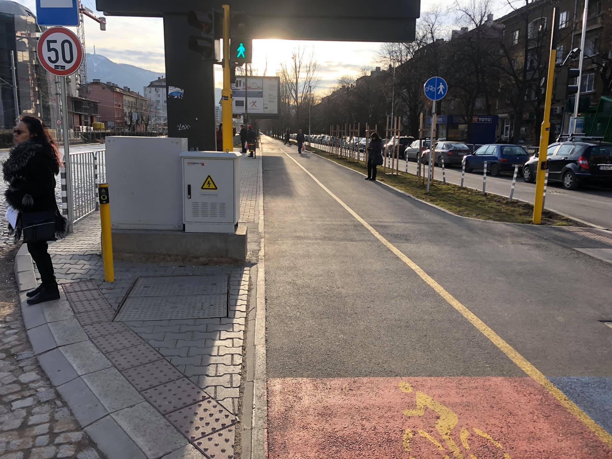 В същото време там се струпват хора, които чакат за автобус или да пресекат на отсрещния тротоар. Те са принудени да навлизат в лентата за колоездачите, защото няма достатъчно място.