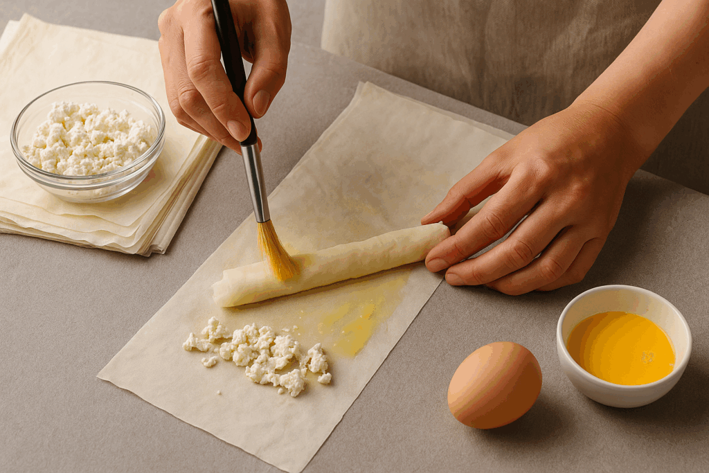 Вземете по две кори една върху друга. Намажете леко с масло или олио. Сложете по 2-3 с.л. от плънката и навийте на руло. Може да ги редите в тавата по дължина или на охлюв.