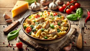 Ако търсите идея за вкусен и лесен обяд или вечеря, тази рецепта за паста с пилешко и зеленчуци е чудесен избор. Кремообразният бешамел придава невероятна текстура, а свежите сезонни зеленчуци балансират вкусовете. Това ястие е перфектен начин да използвате наличните продукти в хладилника и да приготвите богато на протеини и хранителни вещества ястие за цялото семейство.