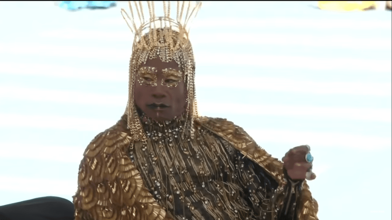 Били Портът, облечен от глава до пети в злато, пресъздал сцена от древен Египет на събитието, носен от шестима мъже без ризи.