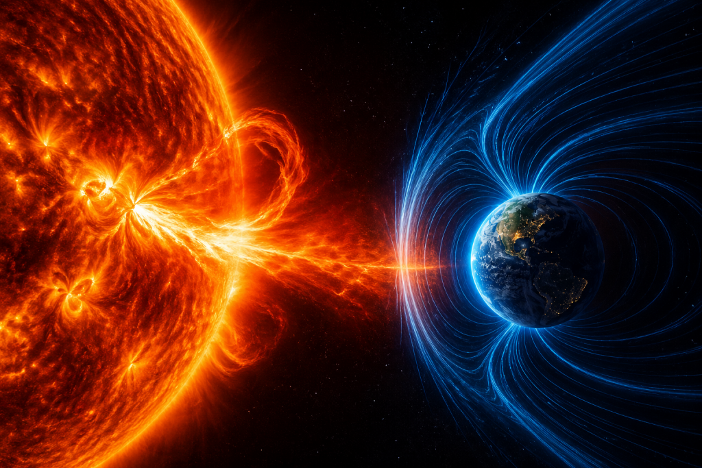 Прогнозата за 28 април 2026 г. е сравнително спокойна по отношение на магнитните бури — не се очаква G1 или по-силна геомагнитна активност. Основното внимание остава върху възможни радиосмущения, тъй като NOAA отчита значителна вероятност за R1-R2 събития.